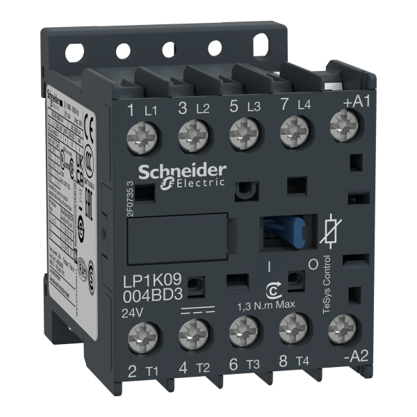 LP1K09004BD3 – TeSys K contactor – 4P (4 NO) – AC-1 <= 440 V 20 A - 24 V DC coil Schneider Electric TeSys K contactor, 4 poles (4NO), for non-inductive load control applications up to 20A/690V AC-1. It provides a 24V DC coil with transient suppressor module, without built-in auxiliary contact, connection by screw clamp terminals. For operating rates until 600 cycles/hour and environments until 50°C, it procures reliability and durability to standard applications. Very compact (45mm width), DIN-rail mounting or screw fixing. Multi standards certified (IEC, UL, CSA, CCC, EAC), Green Premium compliant (RoHS/REACh). TeSys K contactor - 4P (4 NO) - AC-1 <= 440 V 20 A - 24 V DC coil LP1K09004BD3 - TeSys k